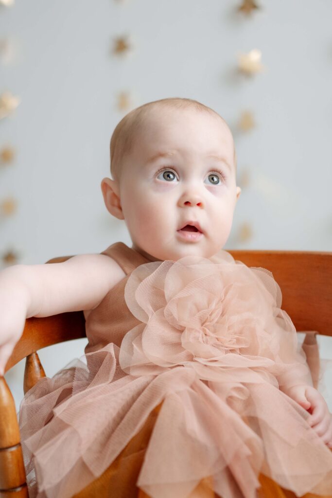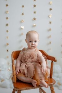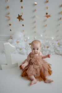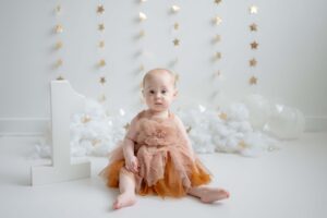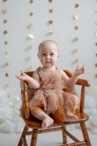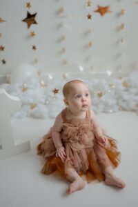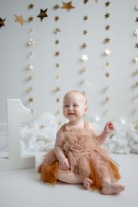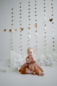 The setup was simple and cozy — fluffy clouds, soft neutral tones, and just enough sparkle from the stars to make everything feel a little magical. Themes like this are perfect for first birthday photos because they keep the focus right where it belongs: on that adorable one-year-old personality.